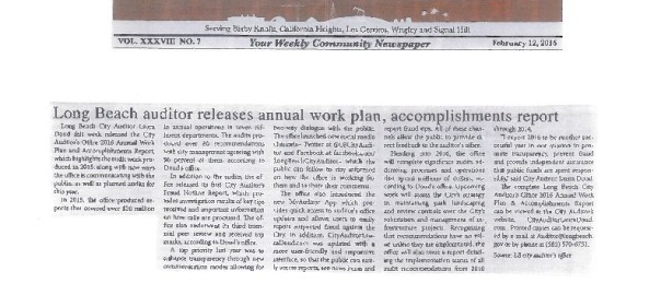 Long Beach Auditor Releases Annual Work Plan, Accomplishments Report