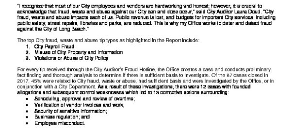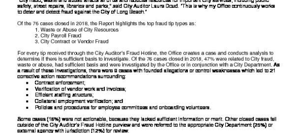 Long Beach City Auditor’s Annual Fraud Hotline Activity Report Highlights Results of Investigated Cases