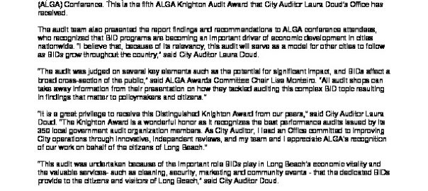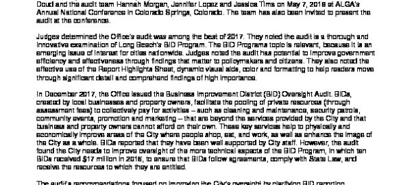 Long Beach City Auditor’s Business Improvement District Oversight Audit Wins National Award
