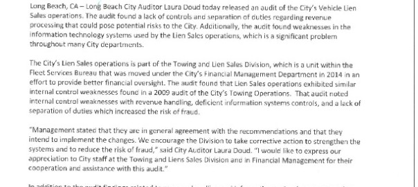 City Auditor Laura Doud Announces Release of Vehicle Lien Sales Audit