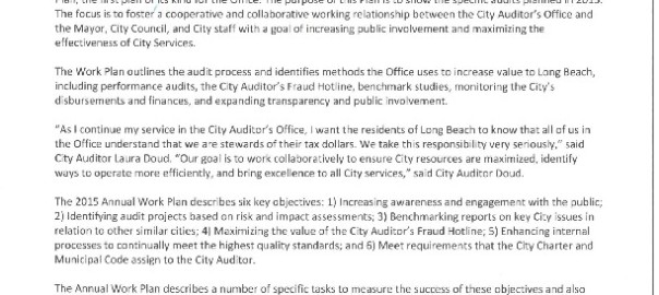 City Auditor Laura Doud Breaks New Ground in Transparency, Cooperation & Public Involvement – Annual Work Plan Aims for Collaboration to Bring Excellence in City Services