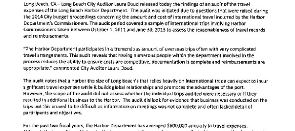 City Auditor Laura Doud Releases Harbor Department’s Travel Expenses Audit