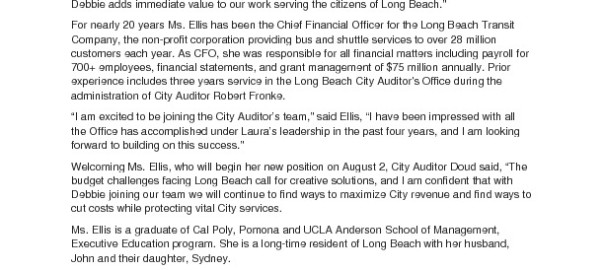 City Auditor Laura Doud Announces Appointment of Assistant City Auditor Deborah Ellis To Join Long Beach City Auditor’s Office